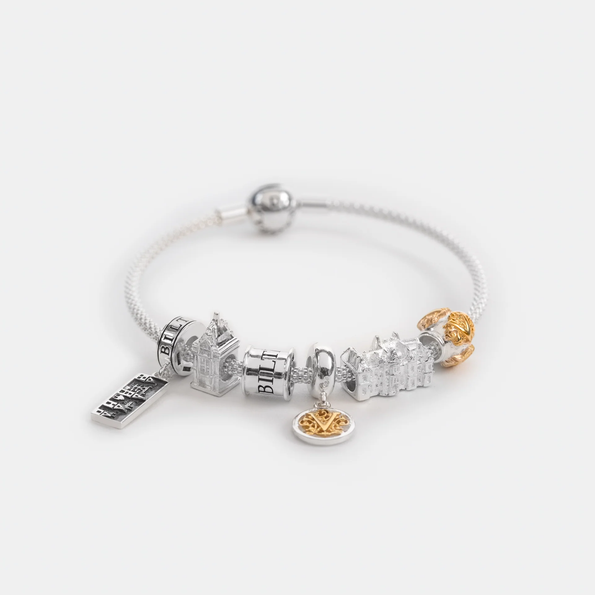 The centerpiece of this sterling silver dangle bead is the George W. Vanderbilt monogram in 18 karat gold. The scrollwork of the monogram is reminiscent of some of the ornate details found at BiltmoreĀ®. Crafted especially for Biltmore, the bead has a substantial silver barrel that is compatible with most bead bracelet brands. Browse our full collection of charms to create an original statement piece.