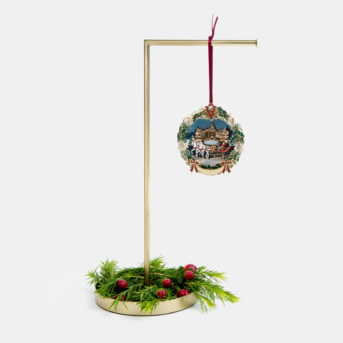 A stunning depiction of winter at Biltmore®, this ornament is a beautiful addition to your tree. White poinsettias and a wreath surround a wintery scene, with a horse-drawn sleigh under a starry night sky. Made of solid brass and finished with 24-karat gold details, this ornament also features the Vanderbilt monogram and Biltmore logo. Handcrafted especially for Biltmore, it is packaged in a lovely gift box.